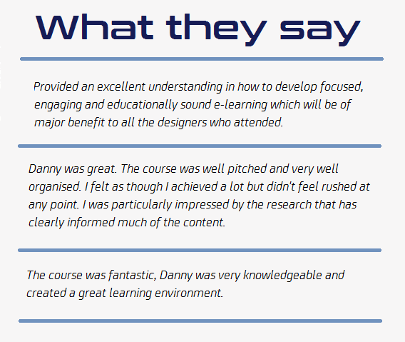Delivered over 3 days, this workshop will equip delegates with the knowledge and skills to confidently design, develop, assess and evaluate e-learning and gain a Level 4 Professional Development Certificate in e-Learning.